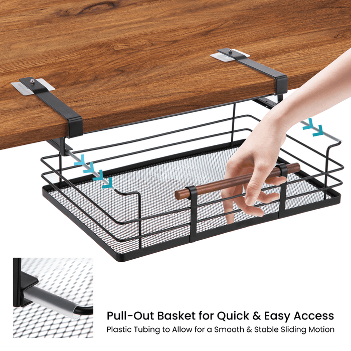Under Shelf Pull-Out Drawer Kitchen Cabinet Organizer with Steel Mesh Basket and Wooden Handle, 17" Length